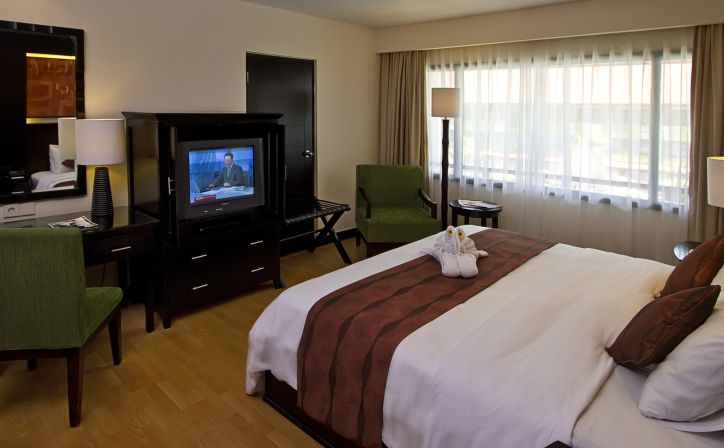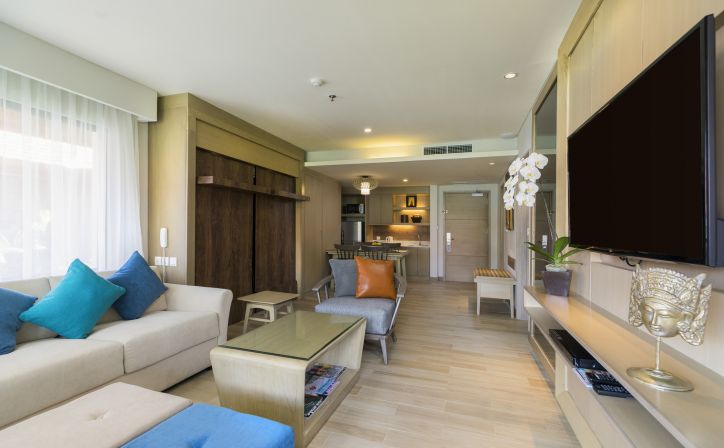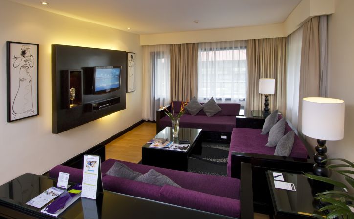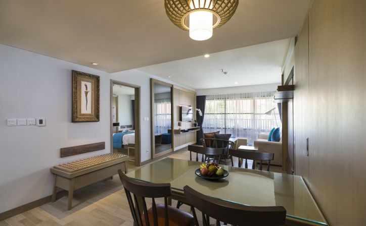 Enjoy a perfect executive suite room in 76 square meters features with small kitchenette with fridge, water dispenser, microwave oven, toaster and kettle. This room is consisting of two standard room bays, the master bedroom has access to the bathroom and as well as the lounge or dining area. It is equipped with free daily 10 items of minibars especially for beverage only and free Wi-Fi access.- Room Size: 76 m2 - Bed Type: King Bed and 3 sofa-beds - Sleeps: 2 adults & 3 children (under 12 years old) - Extra Bed: N/A |