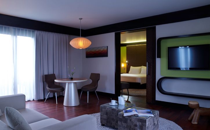 Exclusive Two Bedroom Suite features a spacious room with modern design and separate living room with sofa bed, dining table, and 42″ LCD TV with a DVD player. This is a perfect choice for family with two children.- Max. Number of adults : 4 adults - Max. Number of Kids : 2 kids below 12 years old (using existing bed) - Size of Rooms : 110-140 square meters - Bedding Type : King Size and Hollywood Twin |